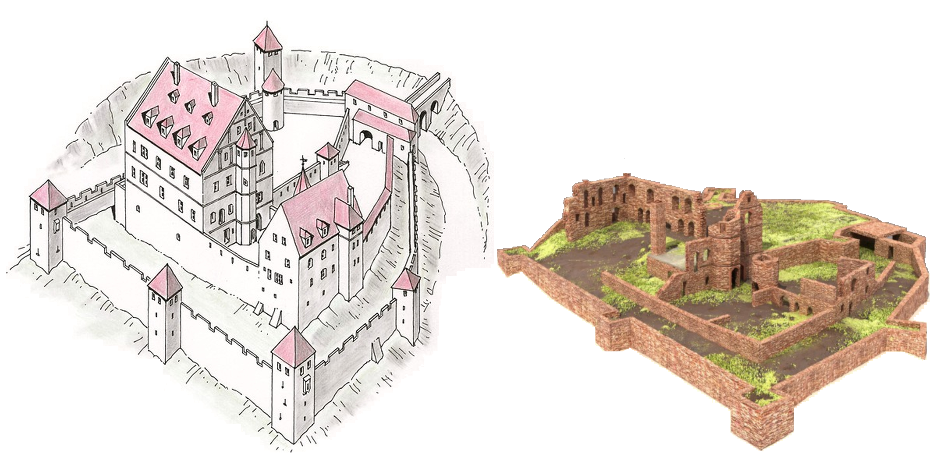 Nachfolgende Rekonstruktionszeichnung von Wolfgang Braun, mit leichten Veränderungen durch C. Full, ist eine künstlerische Interpretation der Kollenburg und gibt einen Eindruck von der Größe und Pracht unserer Burg. Daneben die 3D Darstellung der heutigen Ruine von Timo Breidenbach zum Vegleich.